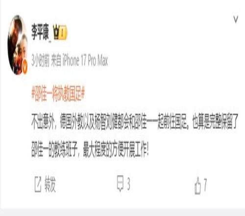 而据记者李平康透露,德国外教毛雷尔,以及杨智和刘健都会与邵佳一一起前往国足,这样也是完整保留了邵佳一的教练班子,有助于邵佳一迅速在国足展开工作,并且有助于邵佳一维护团队协作的连续性和战术执行的一致性。