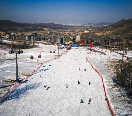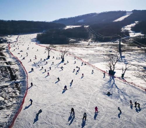 11月22日,滑雪爱好者在吉林市中旅松花湖度假区滑雪(无人机照片)。 新华社记者 许畅 摄