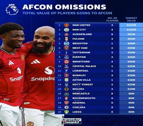 北京时间12月17日,在2025年非洲杯本周末就将打响的情况下,德转列出了英超20支球队非洲杯参赛球员的总身价榜,曼联3人参赛总身价1.47亿欧元排名第一,曼城2人参赛1.05亿欧元第二。