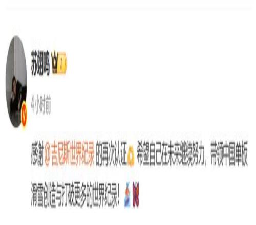 这是苏翊鸣获得的第二个吉尼斯世界纪录认证。此前,他已是“首个完成内转1980抓板动作的运动员”吉尼斯世界纪录保持者。