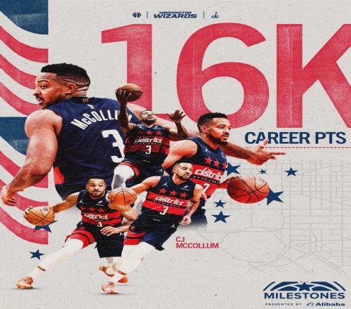 奇才后卫CJ-麦科勒姆本场比赛出战32分钟,15投7中,得到18分4篮板4助攻的数据。