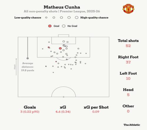 他已经两次击中门柱,并在对阵阿斯顿维拉时错失了一次机会尚可但难度不小的头球。他的跑位很积极,但触球并不总是那么干净利落。 他并非2025-26赛季唯一一位射门状态不佳的曼联球员。B费已经四次击中门框,是英超本赛季次数最多的球员。在阿莫林执教下,曼联本赛季19场英超打进33球,比他在2024-25赛季执教的26场比赛多进3球。随着2026年的到来,曼联和库尼亚都看到了积极信号。阿莫林也许会缺少多名重要球员,但至少,他拥有一名并不惧怕艰难局面的前锋。