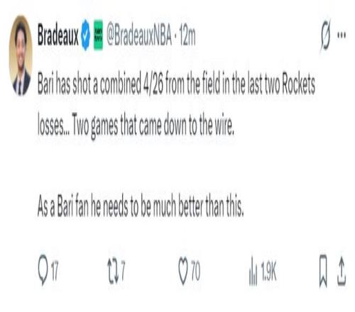 火箭队记Bradeaux写道:火箭队近期接连输给西部排名15、14、13、12、11、9的球队,目前火箭战绩22胜12负,火箭净胜分联盟第二,这真是一支有趣的球队。