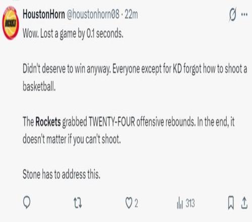 休媒:火箭距离胜利只差0.4秒,实际上他们也不该赢球,除了杜兰特之外所有人都忘记如何投篮,全队拼下24个前场篮板,这样的二次进攻优势都输了,斯通必须解决投篮这个软肋的问题。
