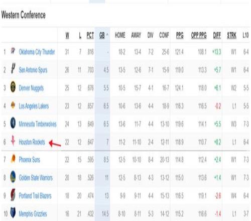 这场比赛后火箭直接从西部第四直落到西部第六,火箭与湖人都拉开0.5个胜场,没有约基奇的掘金接连击败凯尔特人、费城76人再度回到西部第三的位置。