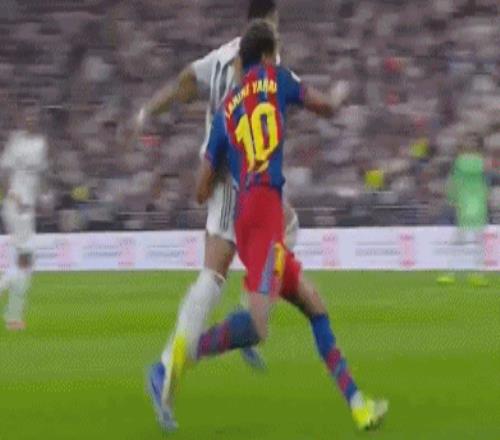 决定比赛走向的一球出现在第73分钟。巴萨在前场通过奥尔莫与费兰·托雷斯的连续配合将球发展到禁区前沿,拉菲尼亚得球后起脚低射,皮球打在皇马后卫阿森西奥脚上发生折射,改变了运行轨迹,让已经做出扑救动作的库尔图瓦无可奈何,巴萨3-2再度领先。
