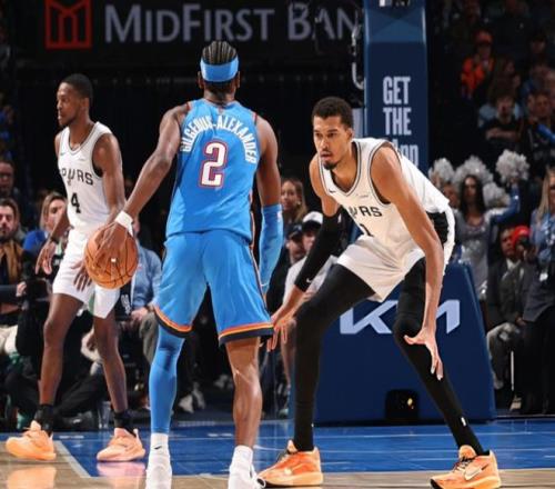 从战术打法和阵容框架来看,马刺确实克制雷霆,丰富的后场资源车轮战消耗亚历山大,文班亚马和科内特镇守篮下,雷霆还没三分投射稳定性。回顾一下比赛,文班亚马本场首发,开场文班亚马就隔扣霍姆格伦,华莱士顶投三分,文班亚马空接继续暴扣,杰威连续单打回应,亚历山大跳投,卡斯尔内突外投咬住比分。中段维金斯和哈珀对轰三分,约翰逊和哈珀带队打停马刺,但节末亚历山大联合卡鲁索打出小高潮,第一节雷霆32-26马刺。进入第二节,文班亚马挑篮+福克斯加速上篮,尚帕尼也轰进三分。