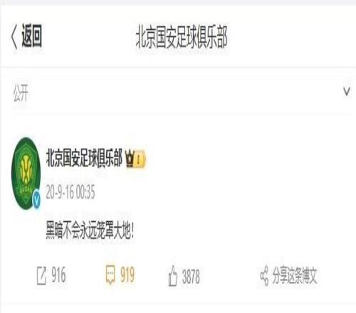 2020赛季,中超第11轮赛后,国安最后时刻3-3被华夏逼平,国安方面表示,针对比赛中出现的争议判罚,俱乐部已经决定上诉。国安官微当时发布的文字,就是争议性十足的“黑暗不会永远笼罩大地”。