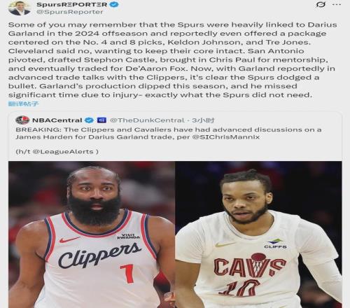 你没看错,据The Athletic记者Tony Jones和Sam Amick联合报道,快船和骑士能否达成交易,取决于快船是否愿意搭上首轮签。马刺记者Dusty Garza转发报道,并写道:2024年休赛期,马刺曾经接近得到加兰,骑士否决了交易。