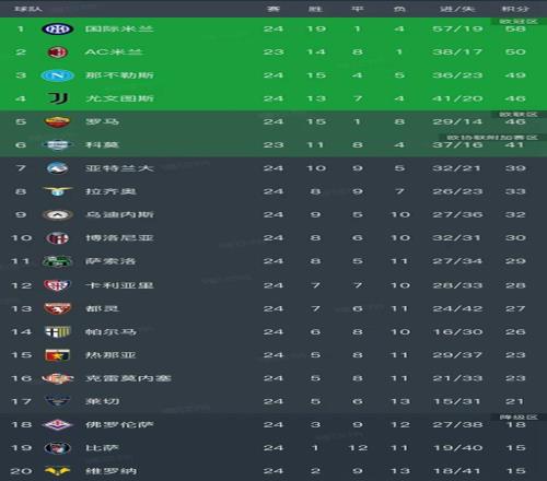 意甲最新积分榜