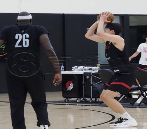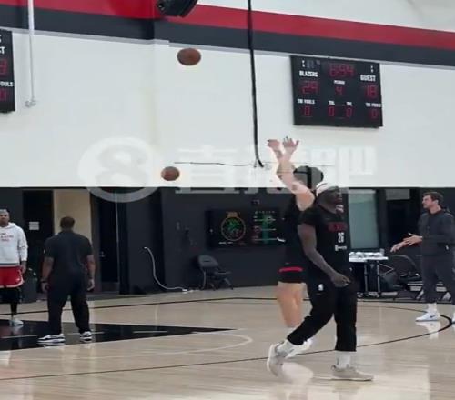 开拓者队内训练里,杨瀚森在跑战术,先是跑到弧顶,接到助教传球之后出手三分,杨瀚森2次出手弧顶三分全部打铁。接下来又回到底角位置去投三分,底角位置杨瀚森第一轮出手2次也只命中了1球,跟他一组的里斯投得那可是非常准的。