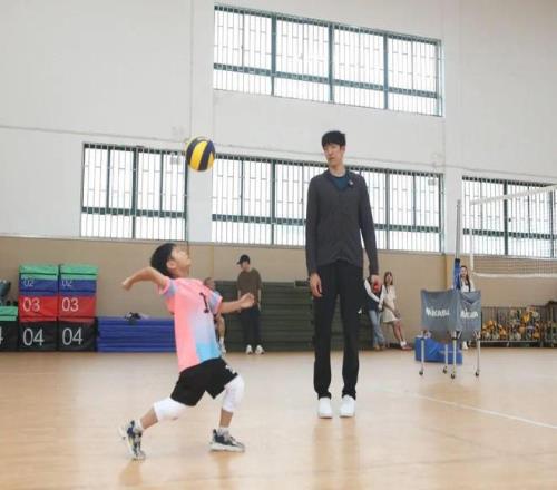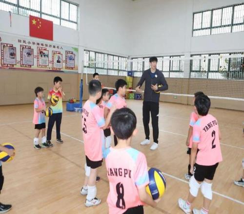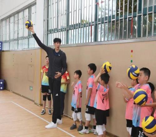 活动的高潮,是张哲嘉老师带来的 “冠军体育课”。他没有直接开始训练,而是先帮同学们梳理基础:“练排球先练‘脚’,脚步要先到位,走到接球的位置,再伸手去接,千万别急着抬手。” 随后,他亲自示范颠球、接球、发球的动作,手把手纠正同学们的姿势 —— 有的同学颠球总掉,张老师就蹲下来教他调整手型;有的同学发球没力气,他就指导如何借助身体的力量。最后,张老师还组织同学们模拟比赛阵型,练习 “一传、二传、扣球” 的配合,尽管同学们的动作还略显青涩,但每一个人都全情投入,操场上满是笑声与汗水交织的美好画面。