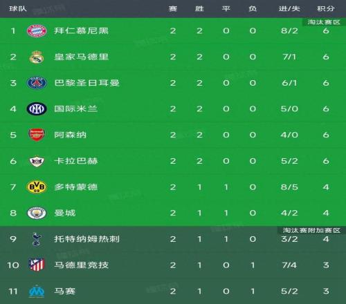 欧冠第二轮结束了所有比赛,最新积分榜如下!