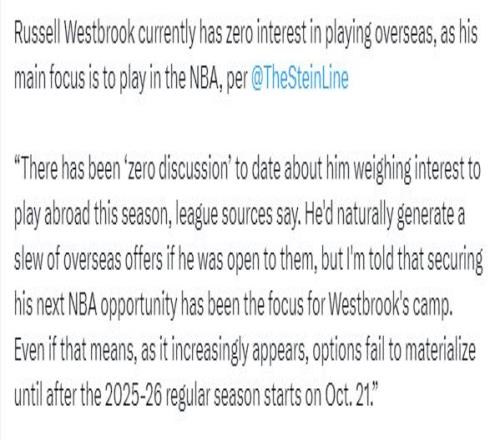 Marc Stein报道,消息人士透露,目前威少本赛季没有考虑去海外打球,如果他愿意的话,自然会收到大量海外合同报价。但我听说,确保下一个NBA机会一直是威少团队的重点,即使这意味着(情况似乎越来越明显)10月21日常规赛开始前可能都无法实现。