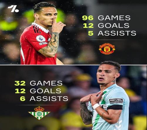 而在本轮西甲梅开二度帮助贝蒂斯2-2战平比利亚雷亚尔后,安东尼在贝蒂斯效力的32场比赛,已经打入12球并有6次助攻,直接参与了18个进球,这也超过了他在曼联96场的数据。