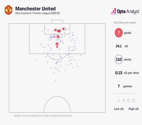 据统计,英超前7轮过后,曼联完成110次射门,总预期进球数为14.1球,两项数据均高居英超第一。不过,7轮过后曼联只有九个进球进账,其中两球还是对手自摆乌龙。