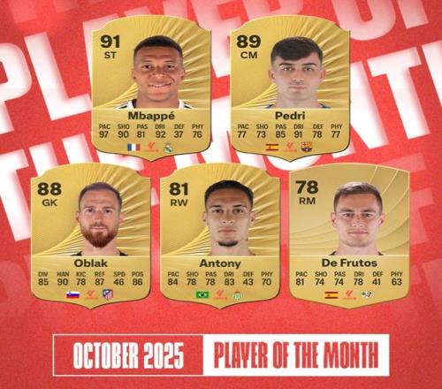 雷速体育10月22日宣 西甲官方公布了10月最佳球员的五位候选人,姆巴佩连续三个月进入提名,佩德里、安东尼在列。