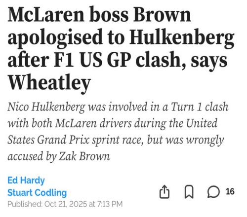 随着红牛车手维斯塔潘逐渐逼近车手总冠军,麦克拉伦车队内部的紧张情绪也在不断升温。在美国站冲刺赛首圈,两位麦克拉伦车手相撞,CEO扎克·布朗神经紧绷,他甚至一度将矛头指向霍肯博格。不过随后扎克·布朗也亲自向这位德国老将道歉,并承认这只是一次典型的首圈事故。