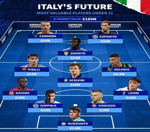 北京时间10月12日,德转统计出了身价最高的意大利U21球员最佳11人阵容,斯卡尔维尼以3500万欧元的身价领衔,皮奥-埃斯波西托、卡马尔达、尼奥托、莱昂尼以及皮西利在列。德转列意
