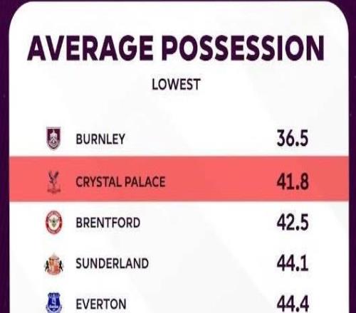本赛季英超已经进行了10轮比赛,根据英超官方的统计数据,水晶宫是本赛季至今平均控球率第二低的球队,但他们的预期进球数最高。本赛季至今英超各队平均控球率最低榜:1、伯恩利 36